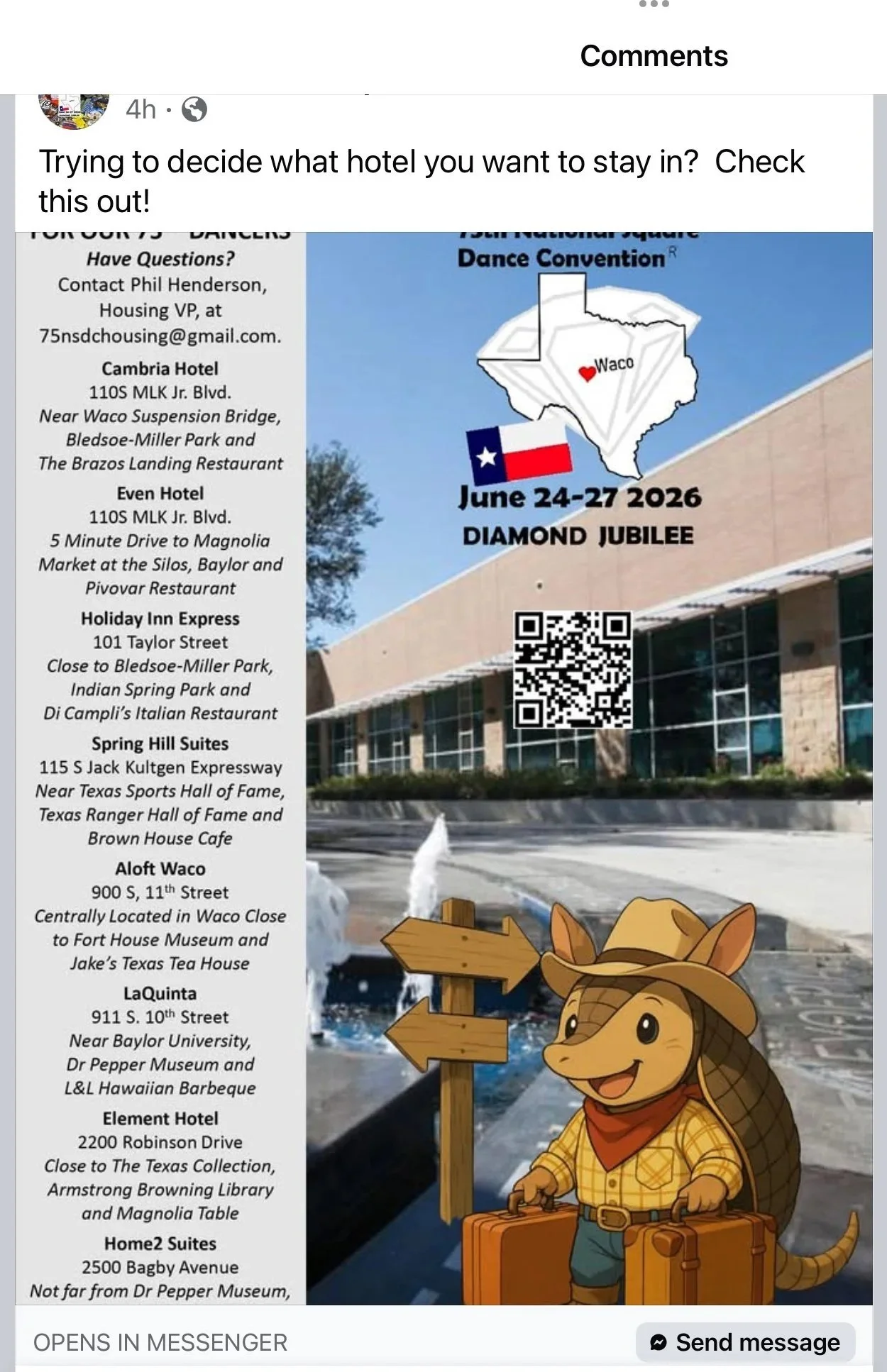 Remember to join our Facebook group, 75th National Square Dance Convention®, for the latest information and updates. The link is as follows https://m.facebook.com/p/75th-National-Square-Dance-Convention-100094911386448/ or scan the adjacent QR Code. We look forward to celebrating the National Square Dance Convention®’s Diamond Jubilee with you in Waco!